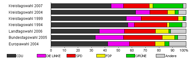 | Kreistagswahl 2007 | 38,1 | 44,5 | 9,1 | 19,1 | 2,9 | 22,1 | 2,4 | |