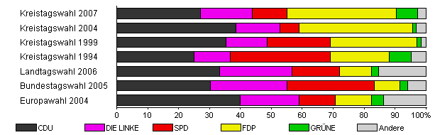 | Kreistagswahl 2007 | 38,4 | 27,1 | 16,8 | 11,2 | 35,3 | 6,9 | 2,7 | |