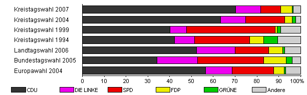 | Kreistagswahl 2007 | 37,5 | 70,2 | 11,6 | 9,1 | 5,3 | 0,4 | 3,5 | |