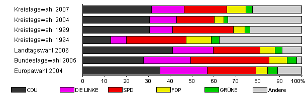 | Kreistagswahl 2007 | 25,2 | 31,4 | 15,0 | 19,5 | 8,7 | 3,0 | 22,4 | |