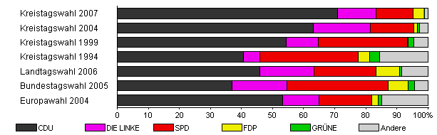 | Kreistagswahl 2007 | 42,2 | 71,0 | 12,3 | 12,0 | 3,3 | 0,4 | 1,1 | |