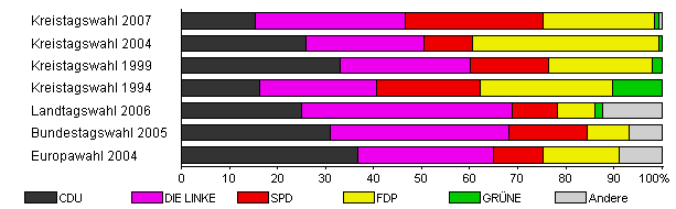 | Kreistagswahl 2007 | 34,2 | 15,4 | 31,3 | 28,6 | 23,1 | 1,1 | 0,5 | |