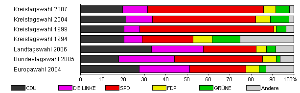 | Kreistagswahl 2007 | 58,5 | 19,8 | 11,6 | 54,4 | 5,9 | 6,4 | 2,0 | |