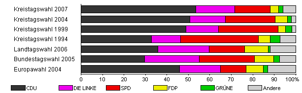 | Kreistagswahl 2007 | 46,0 | 53,4 | 18,2 | 16,6 | 3,9 | 2,0 | 5,9 | |