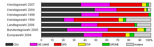 | Kreistagswahl 2007 | 55,1 | 36,1 | 26,5 | 29,3 | 4,1 | 2,0 | 2,0 | |