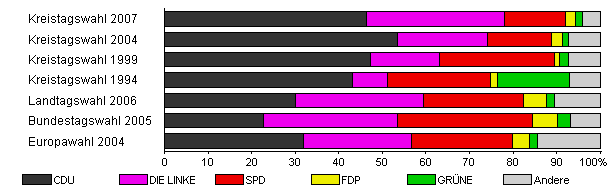 | Kreistagswahl 2004 | 46,2 | 53,4 | 20,8 | 14,6 | 2,5 | 1,4 | 7,3 | |