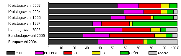 | Kreistagswahl 2004 | 50,2 | 58,5 | 15,4 | 13,6 | 4,5 | 5,2 | 2,7 | |