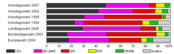 | Kreistagswahl 2007 | 46,5 | 47,5 | 35,5 | 5,1 | 7,4 | 3,7 | 0,9 | |