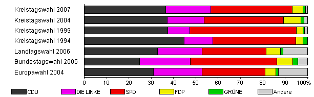 | Kreistagswahl 2004 | 44,0 | 37,3 | 16,5 | 35,4 | 7,9 | 1,3 | 1,5 | |