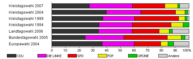 | Kreistagswahl 2007 | 36,4 | 27,4 | 31,4 | 23,5 | 9,5 | 1,4 | 6,7 | |