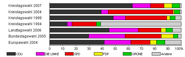 | Kreistagswahl 2007 | 47,8 | 62,9 | 13,7 | 10,4 | 6,2 | 5,7 | 1,0 | |