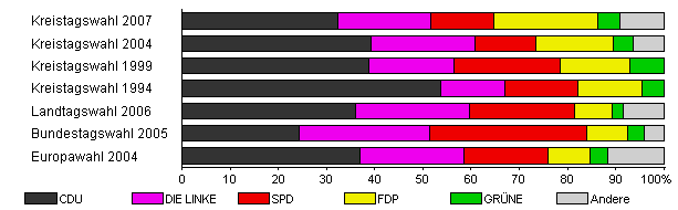 | Kreistagswahl 2007 | 37,5 | 32,4 | 19,2 | 13,2 | 21,6 | 4,5 | 9,1 | |