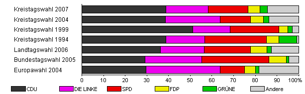| Kreistagswahl 2004 | 46,4 | 38,5 | 25,4 | 14,0 | 5,8 | 2,7 | 13,6 | |