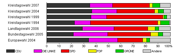 | Kreistagswahl 2007 | 35,8 | 34,9 | 18,3 | 30,0 | 2,4 | 5,9 | 8,5 | |