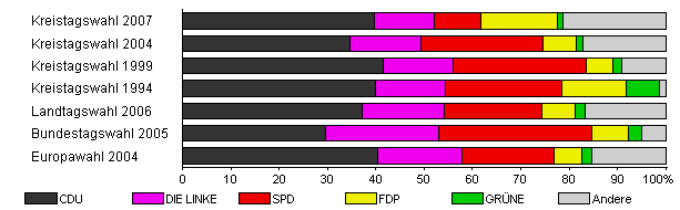 | Kreistagswahl 2007 | 51,6 | 39,6 | 12,4 | 9,7 | 15,8 | 1,3 | 21,2 | |