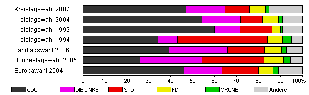 | Kreistagswahl 2004 | 52,4 | 54,2 | 17,6 | 10,0 | 7,3 | 1,7 | 9,2 | |