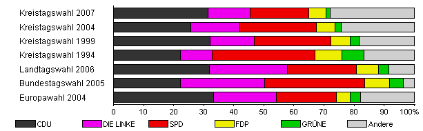 | Kreistagswahl 2007 | 35,0 | 31,4 | 14,1 | 19,4 | 5,7 | 1,4 | 28,0 | |