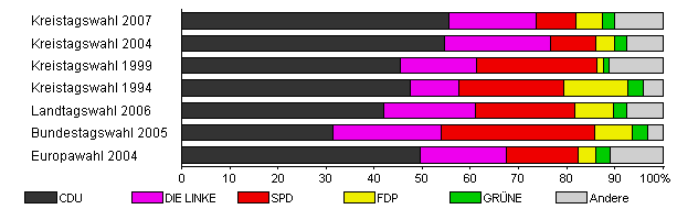 | Kreistagswahl 2007 | 34,9 | 55,6 | 18,2 | 8,1 | 5,6 | 2,6 | 10,0 | |