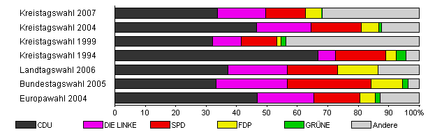 | Kreistagswahl 2007 | 28,3 | 33,8 | 15,7 | 13,2 | 5,2 | 0,3 | 31,8 | |