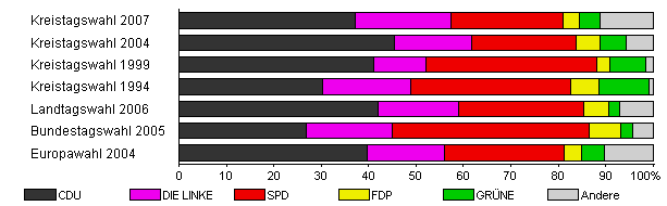 | Kreistagswahl 2007 | 42,4 | 37,1 | 20,3 | 23,7 | 3,3 | 4,5 | 11,1 | |