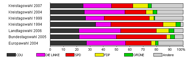 | Kreistagswahl 2007 | 33,8 | 24,8 | 21,3 | 16,1 | 11,4 | 2,5 | 24,0 | |