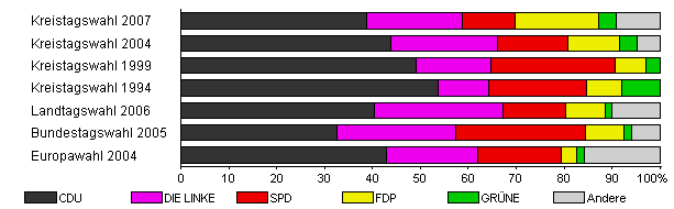 | Kreistagswahl 2007 | 39,8 | 38,7 | 20,0 | 11,0 | 17,5 | 3,7 | 9,1 | |