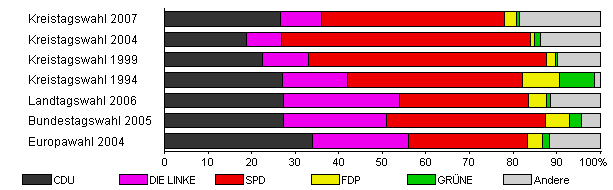 | Kreistagswahl 2007 | 64,5 | 26,7 | 9,3 | 42,1 | 2,6 | 0,7 | 18,6 | |