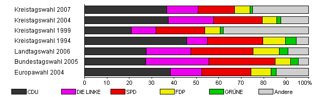 | Kreistagswahl 2007 | 51,9 | 36,7 | 14,1 | 16,3 | 6,8 | 1,2 | 25,0 | |