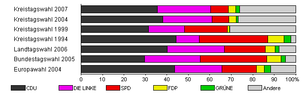 | Kreistagswahl 2007 | 32,8 | 35,6 | 24,8 | 8,3 | 3,3 | 2,0 | 26,0 | |
