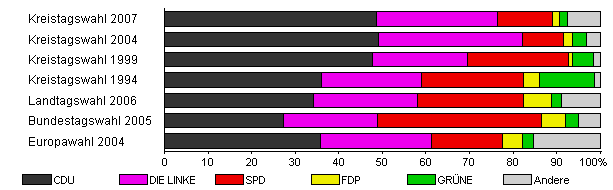 | Kreistagswahl 2007 | 44,6 | 48,7 | 27,7 | 12,6 | 1,7 | 1,9 | 7,4 | |