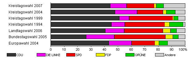 | Kreistagswahl 2007 | 37,7 | 44,2 | 12,3 | 20,3 | 1,8 | 5,4 | 16,1 | |