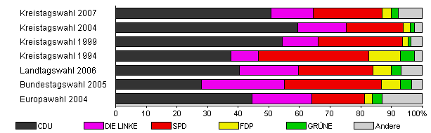 | Kreistagswahl 2007 | 28,9 | 50,8 | 13,8 | 22,5 | 2,8 | 2,3 | 7,9 | |