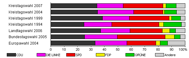| Kreistagswahl 2007 | 44,6 | 34,5 | 19,5 | 29,5 | 2,4 | 7,6 | 6,5 | |