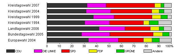 | Kreistagswahl 2007 | 37,1 | 32,1 | 15,5 | 39,0 | 4,9 | 2,6 | 5,8 | |
