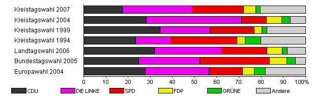| Kreistagswahl 2007 | 38,3 | 17,5 | 31,3 | 23,3 | 5,5 | 2,1 | 20,4 | |
