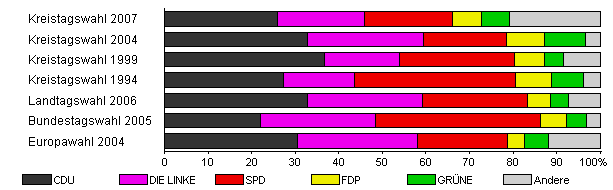 | Kreistagswahl 2007 | 34,2 | 26,0 | 20,0 | 20,1 | 6,7 | 6,4 | 20,9 | |