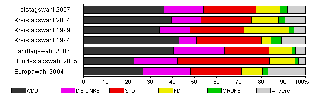 | Kreistagswahl 2007 | 49,4 | 36,3 | 17,6 | 23,7 | 11,1 | 3,2 | 8,0 | |