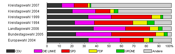 | Kreistagswahl 2007 | 32,9 | 12,0 | 9,8 | 11,1 | 1,5 | 1,0 | 64,6 | |