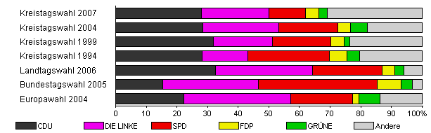 | Kreistagswahl 2007 | 38,0 | 27,9 | 22,1 | 11,9 | 4,4 | 2,8 | 30,9 | |