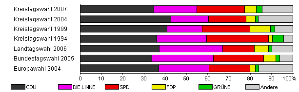 | Kreistagswahl 2007 | 55,8 | 34,6 | 20,3 | 22,4 | 5,5 | 2,9 | 14,2 | |