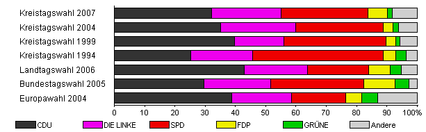 | Kreistagswahl 2007 | 42,0 | 32,2 | 22,9 | 28,7 | 6,4 | 1,6 | 8,1 | |