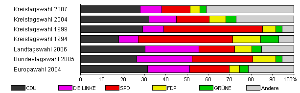 | Kreistagswahl 2007 | 37,0 | 27,9 | 10,3 | 13,2 | 4,7 | 2,9 | 41,0 | |