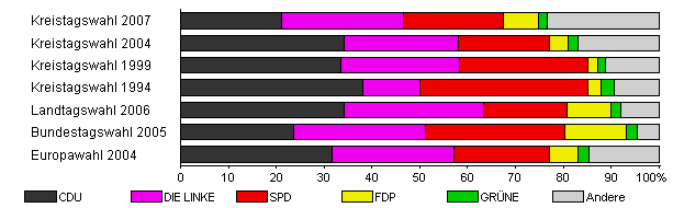 | Kreistagswahl 2007 | 52,5 | 21,1 | 25,6 | 20,7 | 7,5 | 1,8 | 23,2 | |