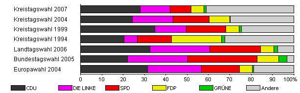 | Kreistagswahl 2007 | 41,9 | 27,9 | 14,2 | 9,8 | 6,0 | 1,1 | 41,1 | |