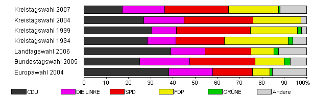 | Kreistagswahl 2007 | 35,5 | 17,3 | 19,0 | 28,7 | 22,5 | 0,6 | 12,0 | |