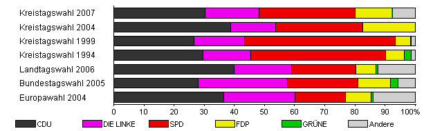 | Kreistagswahl 2007 | 40,4 | 30,4 | 17,7 | 32,0 | 12,1 | 0,2 | 7,6 | |