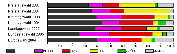 | Kreistagswahl 2007 | 36,2 | 32,6 | 11,2 | 13,2 | 28,3 | 2,1 | 12,6 | |
