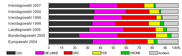 | Kreistagswahl 2004 | 39,2 | 35,1 | 24,7 | 17,9 | 7,6 | 1,3 | 13,3 | |