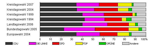 | Kreistagswahl 2007 | 47,7 | 34,1 | 21,7 | 17,6 | 13,3 | 1,4 | 11,8 | |