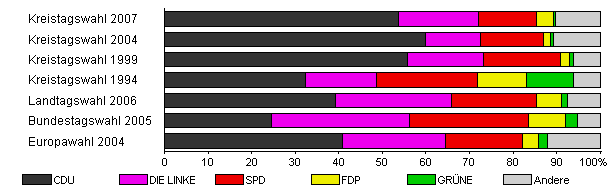 | Kreistagswahl 2004 | 42,6 | 60,0 | 12,5 | 14,4 | 1,7 | 0,6 | 10,9 | |